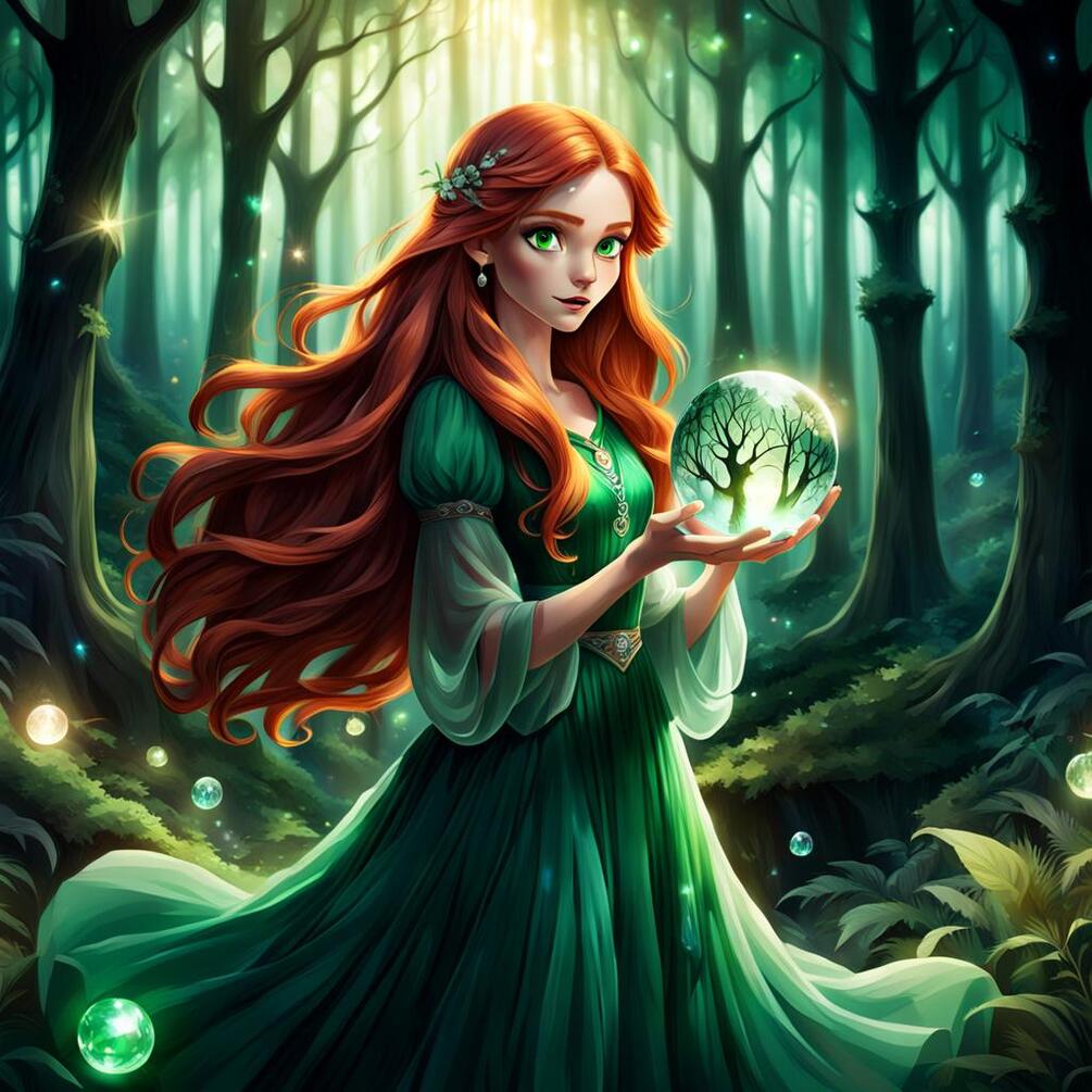 2.Design a semi-realistic cartoon character of a young woman with long red hair, green eyes, and a mystical vibe, wearing a flowy dress and holding a crystal ball, with a magical forest background and a glowing light effect. The final image should be in 10K resolution.